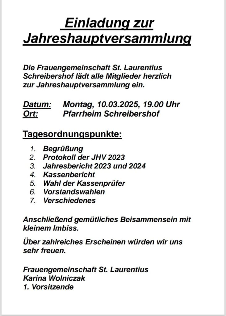 Die Frauengemeinschaft St. Laurentius Schreibershof lädt alle Mitglieder herzlich zur Jahreshauptversammlung ein.